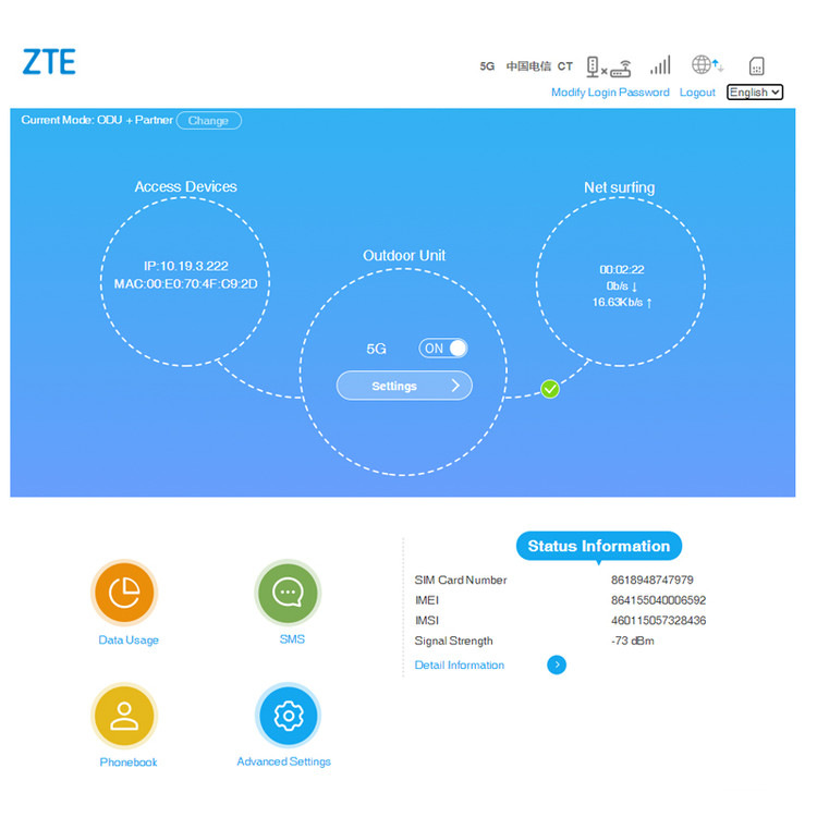 در پنل مدیریتی این مودم میتوانید ابزارهایی مانند فایروال، کنترل والدین، بهروزرسانی خودکار فریمویر، فیلترسازی آدرسهای IP و MAC، ارسال و دریافت پیامک (SMS)، مدیریت مخاطبان، مدیریت مصرف کاربران، وی پی ان کلاینت، تنظیمات VoIP، ابزار عیبیابی سیگنالهای ۵G و...